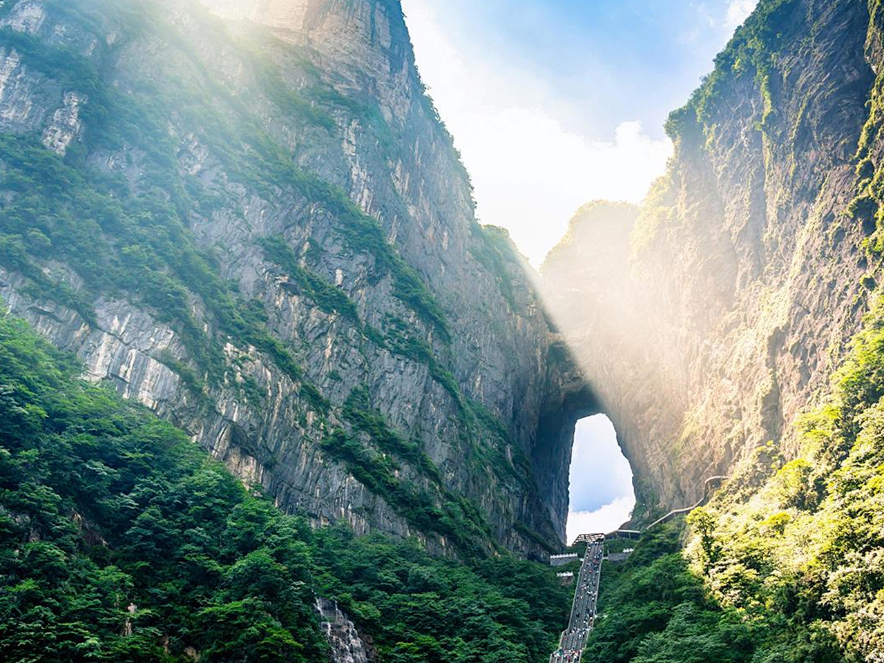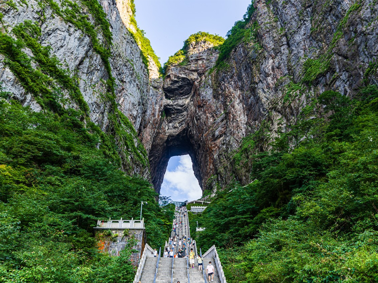 After breakfast, you will head to Tianmen Mountain, where you will take a cable car to the top. Tianmen Mountain features the “Heavenly Gate,” a natural rock formation resembling a doorway to the sky. At the summit, you can walk along the glass walkway, feeling the thrill of being suspended above the ground while taking in the breathtaking views below.